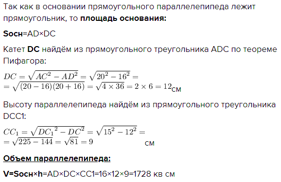 Задан прямоугольный параллелепипед ABCDA1B1C1D1, в котором AC = 20, AD = 16, C1D = 15.