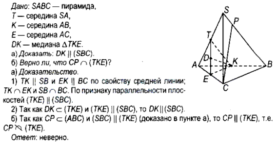 отрезок DK — медиана треугольника TKE (рис. 131, а). а) Докажите, что прямая DK параллельна плоскости SBC. б) Верно ли, что прямая CP пересекает плоскость TKE?