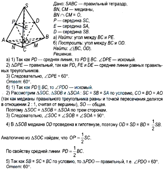 — середины ребер SC, SA и SB соответственно (рис. 123). а) Найдите угол между прямыми ВС и PE. б) Перечертите рисунок в тетрадь. Постройте угол между прямыми BC и OD, найдите этот угол.