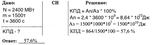 Тепловая электростанция мощностью 2400 МВт потребляет 1500 т угля в час. Каков КПД электростанции?