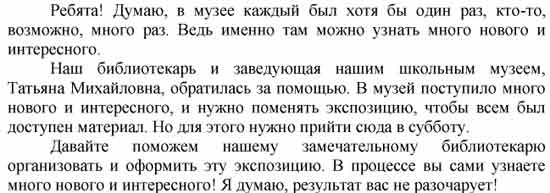 д. Ваша задача - убедить слушателей, что необходимо прийти в ближайший выходной день для того, чтобы помочь в создании школьного музея (в восстановлении памятника культуры и т. д.). Составьте устное выступление-обращение в публицистическом стиле. Уточните свою тему. Запишите развёрнутый план, рабочие материалы к нему. Потренируйтесь дома в устном выступлении.