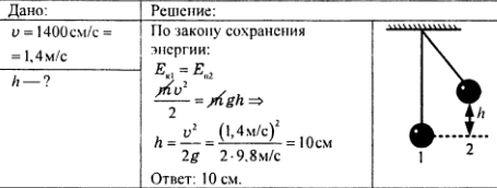 Определите высоту подъема металлического шара, подвешенного на нити, если скорость его движения через положение равновесия равна 140 см/с.