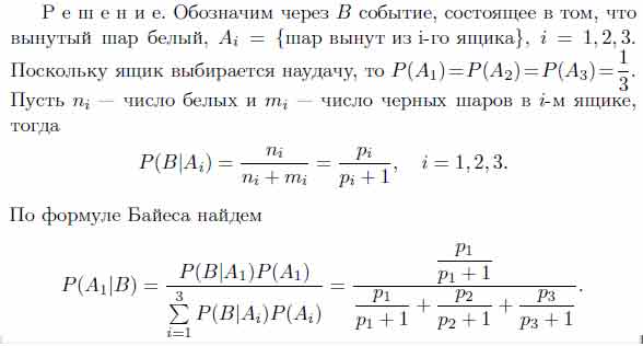 черных равно p1, p2, p3 для первого, второго и третьего ящиков соответственно. Наудачу (с вероятностью 1/3) выбирается ящик и из него шар. Оказалось, что этот шар белый. Какова вероятность того, что шар был вынут из первого ящика?