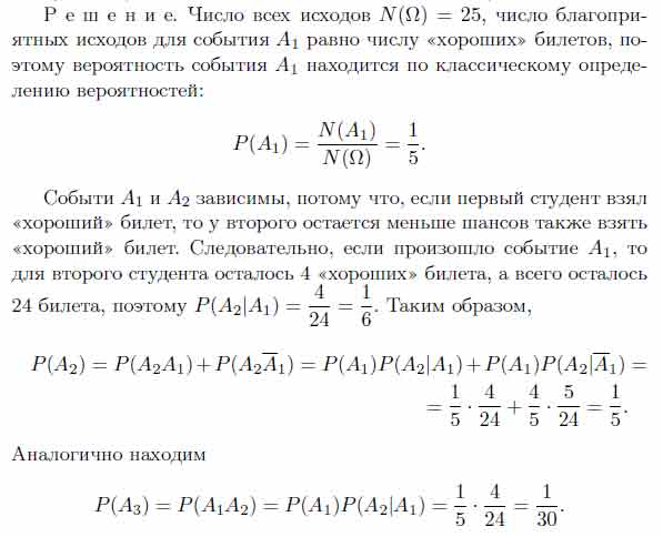 Среди 25 экзаменационных билетов 5 «хороших». Два студента по очереди берут по одному билету. Найти вероятности событий: