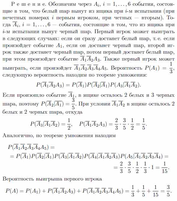 одному шару, не вкладывая их обратно. Выигрывает тот, кто раньше вынет белый шар. Найти вероятность того, что выиграет первый игрок.