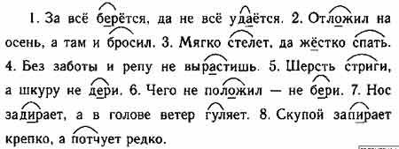 1. За всё б..рётся, да не всё уд..ётся. 2. Отл..жил на осень, а там и бросил. 3. Мягко стелет, да ж..стко спать. 4. Без заботы и репу (не)выр..стишь. 5. Шерсть стриги, а шкуру не д..ри. 6. Чего (не)пол..жил — (не)б..ри. 7. Нос зад..рает, а в голове ветер гуляет. 8. Скупой зап..рает крепко, а потчует редко.