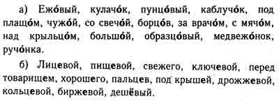 Еж..вый, лиц..вой, кулач..к, пищ..вой, свеж..го, ключ..вой, перед товарищ..м, пунц..вый, каблуч..к, хорош..го, под плащ..м, чуж..й1, пальц..в, со свеч..й, борц..в, за врач..м, под крыш..й, с мяч..м, над крыльц..м, больш..й, дрожж..вой, кольц..вой, образц..вый, бирж..вой, деш..вый, медвеж..нок, руч..нка.