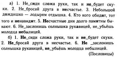 1. (Не)с..ди сл..жа руки, так и (не)буд..т скуки. 2. (Не)бр..сай друга в (не)счастье. 3. (Не)болыной д..ждишко — лодырям отдышка. 4. Кто кого обид..т, тот того и (не)навид..т. 5. (Не)счастные дни долго пам..тны бывают. 6. (Не)заслонишь солнышка рук..вицей, (не)убьёшь молодца (не)былицей.(Пословицы)