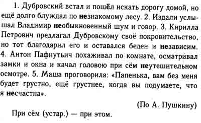 1. Дубровский встал и пош..л искать дорогу домой но ещё долго блуждал по (не)знакомому лесу.5 2. Издали услышал Владимир (не)обыкновенный шум и говор.3. Кирила Петрович предлагал Дубровскому своё покровительство, но тот благодарил его и остался беден и (не)зависим. 4. Антон Пафнутьич похаживал по комнате осматривал замки и окна и качал головою при сём (не)утешительном осмотре. 5. Маша проговорила Папенька вам без меня будет грустно, ещё грустнее, когда вы подумаете что я (не)счастна.(По А. Пушкину)