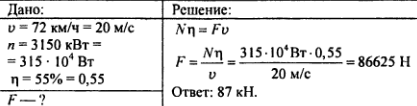 Моторы корабля при движении со скоростью 72 км/ч затрачивают мощность 3150 кВт. КПД моторов и передающих механизмов 55%. Какова силы тяги моторов?