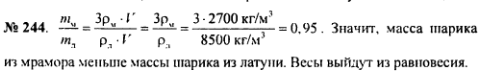 На одну чашу весов положили мраморный шарик, на другую — шарик из латуни, втрое меньший по объему. Останутся ли весы в равновесии?