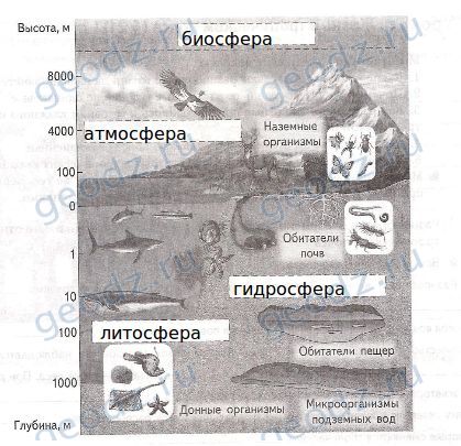 3) Обозначь верхнюю границу биосферы и ее высоту; нижнюю границу биосферы и ее глубину