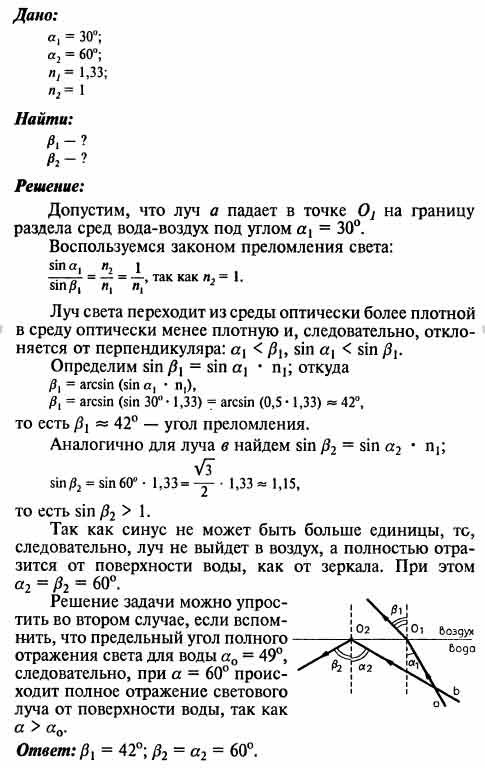 Начертите ход лучей, которые падают на границу вода-воздух под углом 30° и 60°.