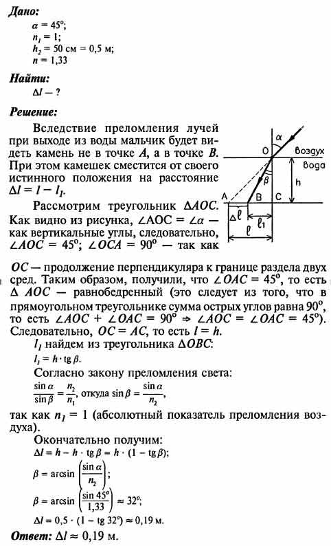 углом 45°. На каком расстоянии от камешка воткнется палка в дно ручья, если его глубина 50 см?