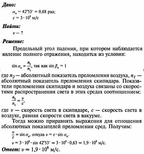 Лучи света выходят из скипидара в воздух. Предельный угол для этих лучей 42°53'. Определить скорость