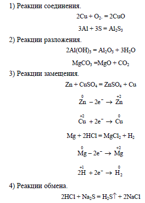 Согласно схеме, приведите по два примера реакций разложения, соединения, замещения, кроме указанных в ней. Напишите