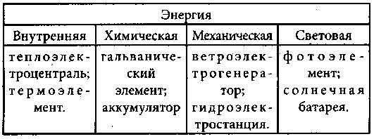 Впишите в эту таблицу устройства для получения электрического тока в соответствии с тем видом энергии, который они используют: фотоэлемент, гальванический элемент, аккумулятор, ветроэлектрогенератор, солнечная батарея, теплоэлектроцентраль, гидроэлектростанция, термоэлемент.