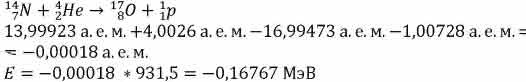 Оцените выход ядерной реакции 14/7N + 4/2He -» 17/8O + 1/1p, зная, что масса ядра