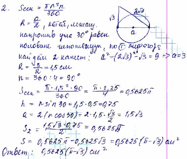 В прямоугольном треугольнике с гипотенузой 2√3 см и острым углом 30° на меньшем катете как