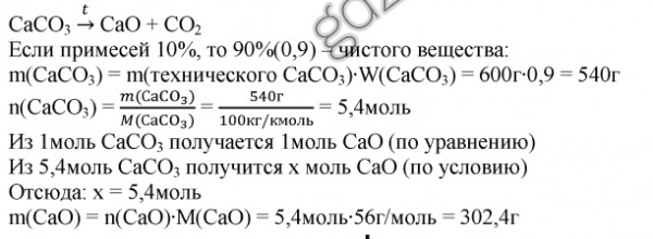Рассчитайте массу оксида кальция, который можно получить при термическом разложении 600 г известняка, содержащего 10% примесей
