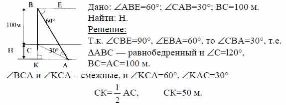 подножия горы наблюдают сначала с вершины В башни под углом 60° к горизонту, а потом с её основания С под углом 30°. Найдите высоту Н горы