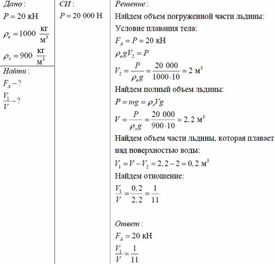 Льдина весом 20 кН плавает в воде. Определите выталкивающую силу, действующую на льдину. Какая часть