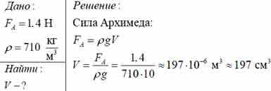 Определите объем куска меди, на который при погружении в бензин действует выталкивающая сила 1,4 Н.