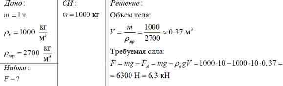 Какая требуется сила, чтобы удержать в воде мраморную плиту массой 1 т?