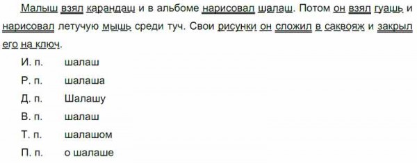 Малы[ш] взял каранда[ш] и в альбоме нарисовал шала[ш]. Потом он взял гуа|ш] и нарисовал летучую мы[ш] среди ту[ч']. Свои рисунки он сложил в саквоя[ш] и закрыл его на клю[ч'].