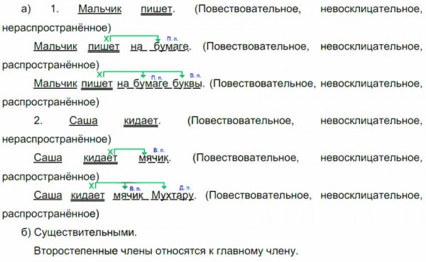 б) Словами какой части речи были дополнены предложения? Определи падеж этих слов. К какому слову каждое из них относится? Что общего между второстепенными членами предложений?