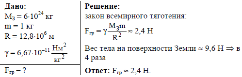 радиусу Земли? Во сколько раз она меньше той, что действует на то же тело на поверхности Земли? Масса Земли 6 ⋅ 10^24 кг, радиус Земли 6400 км