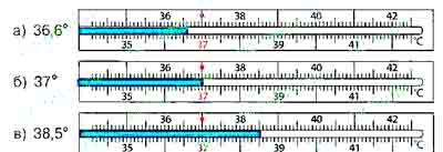 1) Закрасьте на рисунках столбик трутного термометра так, чтобы показать температуру: