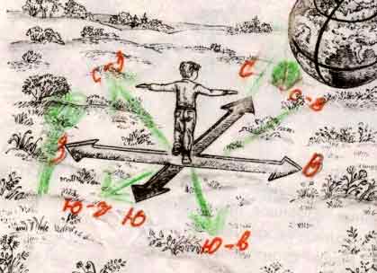 основные стороны горизонта, а зеленым - промежуточные стороны горизонта. Дополни рисунок: нарисуй кустарник, который находится на северо - востоке от Миши, и дерево, которое расположено на юго-западе.