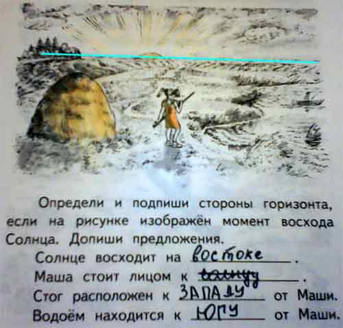 Определи и подпиши стороны горизонта, если на рисунке изображен момент восхода Солнца. Допиши продолжения.